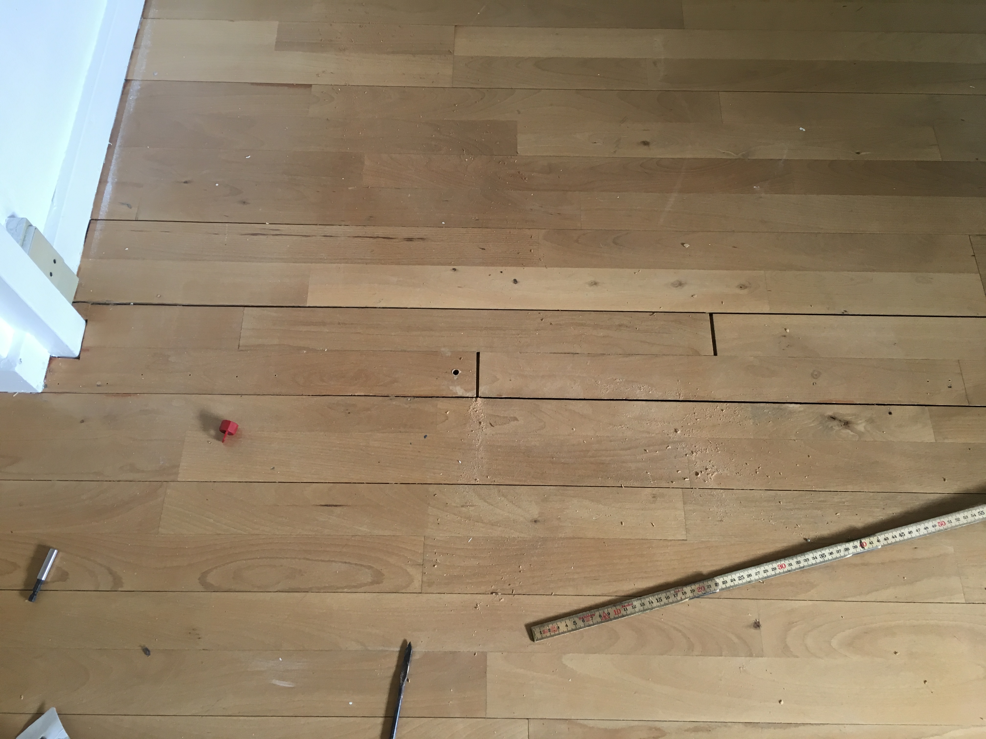 - Fyrretræsplankegulv før slibning